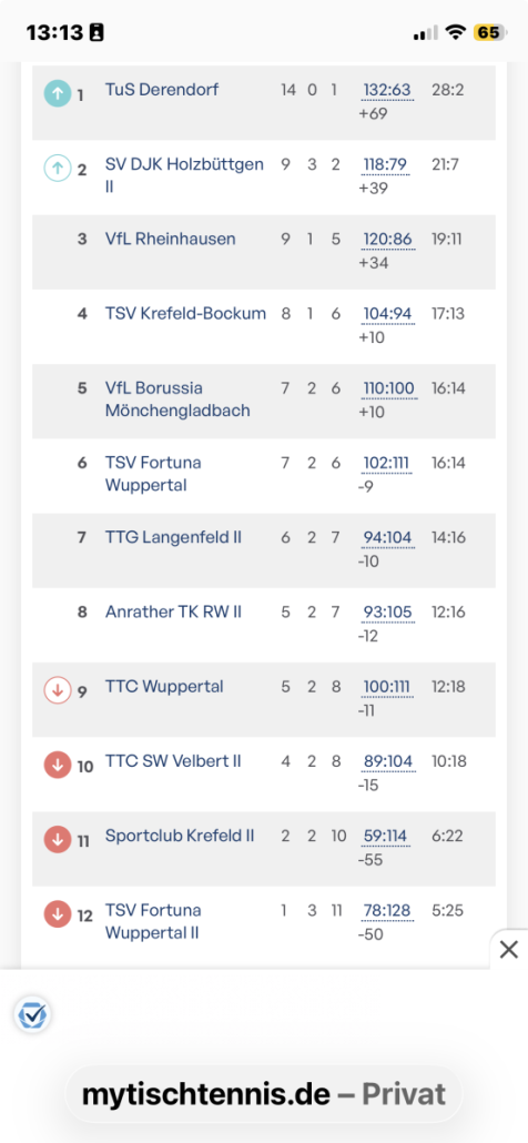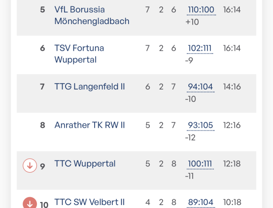 Doch ab dann war der Tischtennis Gott nicht mehr auf unserer Seite. Christian und Jens verlieren ihre Spiele jeweils knapp, Bernhards Block hatte gegen den sicher spielenden Hinten keine Wirkung und auch Tim konnte eine 2:0 Führung nicht ins Ziel bringen. Zwischenstand: 3:6. Dennis blieb dann gegen Liebold chancenlos. Einzig Thomas konnte nochmal verkürzen. Christian und Jens hatten dann jeweils wieder in vier knappen Sätzen das Nachsehen. Mit 4:9 war die Niederlage vielleicht einen Hauch zu hoch – aber die Gladbacher sind schon Heimstark und der Sieg nicht unverdient. Es bleibt weiter super spannend in der Liga. Vielleicht tut uns die Karnevalspause ganz gut.