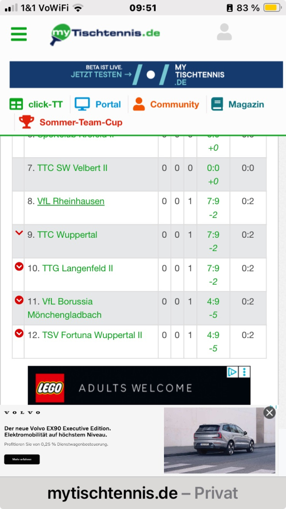 Nach den den Doppeln war noch alles gut. Etwas glücklich sind wir mit einer 2:1 Führung gestartet. Thomas und Christian, sowie Bernie und Jens konnten sich hauchdünn jeweils in der Verlängerung des im fünften Satzes durchsetzen. Patrick und Tim hatten gegen das Spitzendoppel mit 1:3 das Nachsehen. In jedem Paarkreuz kam es dann zur Punkteteilung – so dass wir zur Halbzeit noch aussichtsreich mit 5:4 vorne lagen. Ich höre noch Patrick auf der Bank sagen: „Das gewinnen wir 9:5“. Dann wurde es bitter für uns – Thomas verliert gegen van Steenwijk Junior und auch Christian und Jens verlieren ihre Einzel in der Mitte. Bitter: Christian hatte Matchball. Patrick hält uns mit seinem knappen Sieg gegen Reiners zumindest im Rennen. In den beiden letzten Einzeln nahm die Dramatik dann zu. Bernies Sportschuhe hatten sich im ersten Einzel aufgelöst, so sehr tanzte er da um den Tisch herum. Aber auch mit Strassenschuhen hatte er seinen Gegner im Griff. Dafür war Tim das Glück gegen einen unangenehm spielenden Materialspieler nicht hold. Nach gutem Start lag er im fünften Satz bereits mit 7:10 zurück – erkämpfte sich aber noch Matchbälle. Das Wunder von Anrath blieb aus -am Ende fehlte in der entscheidenden Situation einfach der Mut. Es paste ins Bild, das wir im Schlussdoppel in allen drei Sätzen mit 10:12 das Nachsehen hatten. Am Ende eine ganz bittere 7:9 Niederlage, die absolut vermeidbar war. Wir stehen nun schon nach dem ersten Spieltag gefühlt unter Druck. Kommende Woche folgt das Derby gegen Fortuna Wuppertal II – voraussichtlich auch eine ganz schwere Partie für uns.